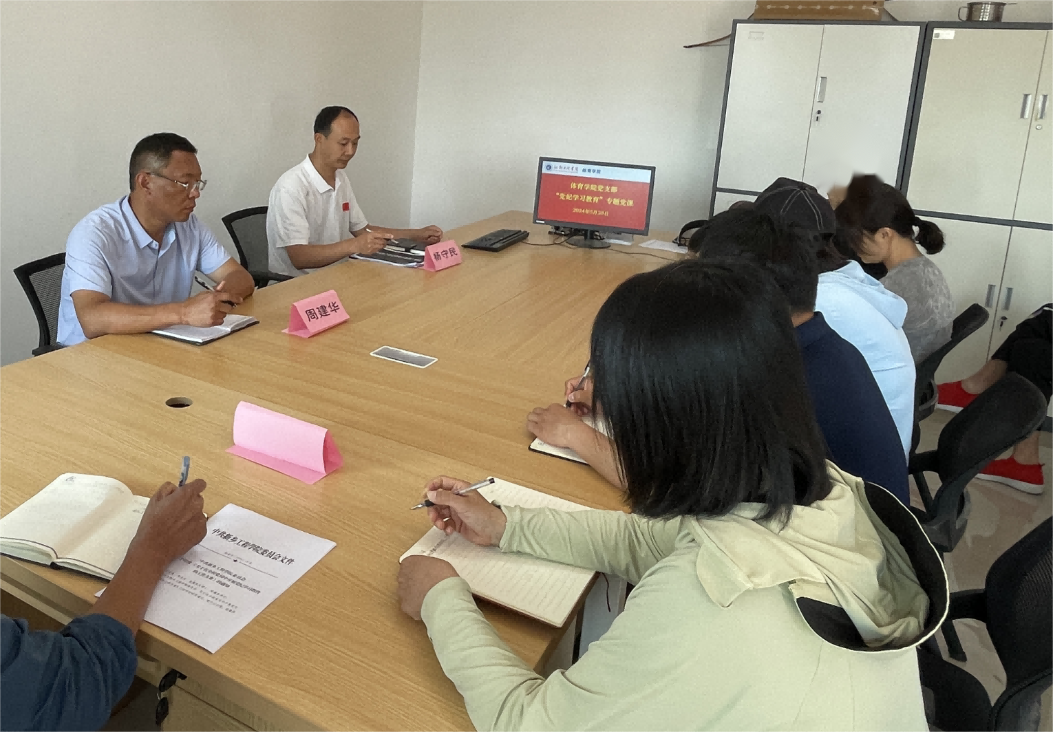 为深入学习贯彻习近平总书记关于加强党的纪律建设重要论述以及关于党纪学习教育重要讲话和重要指示精神,强化党员纪律意识,进一步严明党的纪律规矩,体育学院支部书记杨守民同志于5月28日上午在体育学院教研室为全体党员讲授党纪学习教育专题党课,会议由组织委员侯小栓主持。
