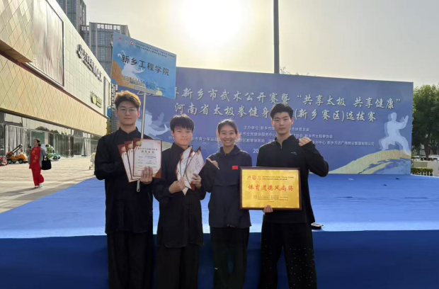 近日,2025年新乡市武术公开赛暨“共享太极 共享健康”河南省太极拳健身大赛(新乡赛区)圆满落幕。本次比赛吸引了来自全市多所学校及广大武术爱好者的数百名选手同场竞技,竞争异常激烈。我校武术队由孙杉老师带队,组织4名队员参加了陈氏太极拳、八极拳、八卦掌、太极剑等项目。