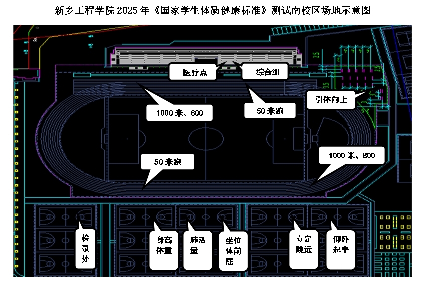 身高、体重、肺活量、坐位体前屈、立定跳远、1分钟仰卧起坐(女)在篮球场进行;引体向上(男)在田径场南头进行;50米跑、800米跑(女)、1000米跑(男)在田径场进行。