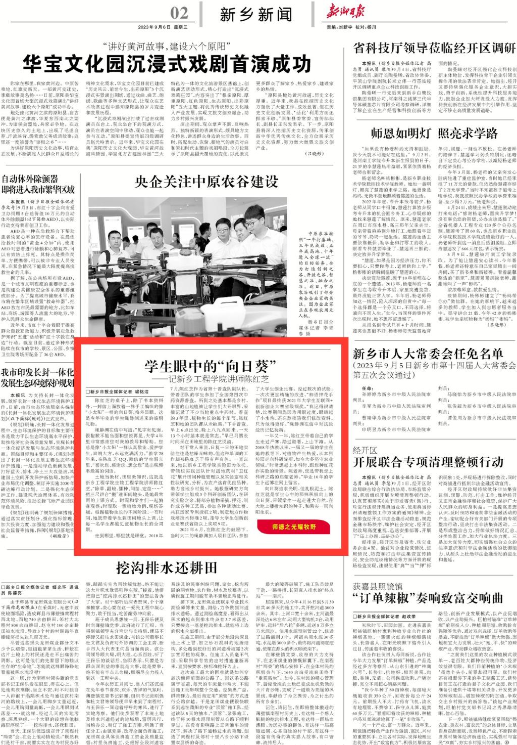 2023年9月6日,在全国第39个教师节来临之际,《新乡日报》第二版对我校教师陈红芝进行了名为《学生眼中的“向日葵”》的报道。报道如下: