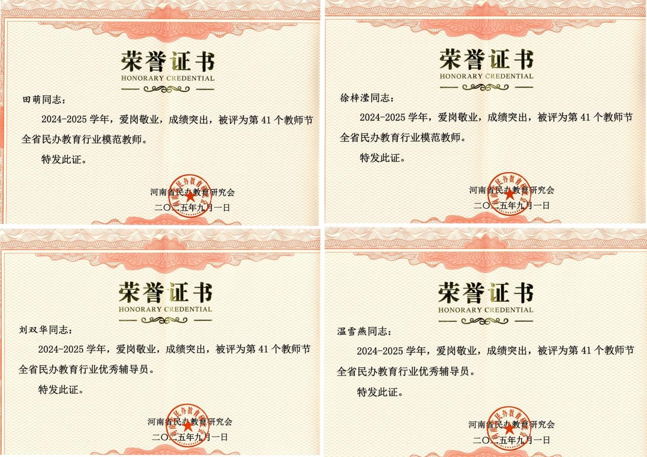 在河南省民办教育研究会第 41 个教师节表彰活动中,我校文法学院教师徐梓滢、马克思主义学院教师田萌获评 “民办教育行业模范教师”,食品工程学院教师刘双华、外国语学院教师温雪燕获评“民办教育行业优秀辅导员”。