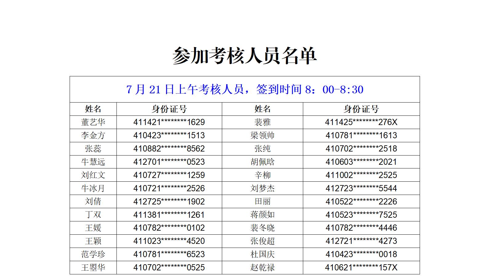 考核时间:7月21日上午8:30——12:00,参加考核人员名单见附件。