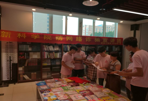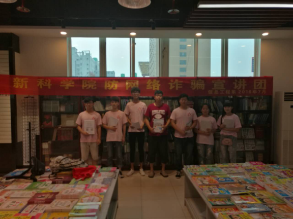 2016年7月4日河南科技学院新科学院15级学生在辅导员崔征老师的带领下,在新乡市新华书店展开了预防网络诈骗暑假社会实践活动。