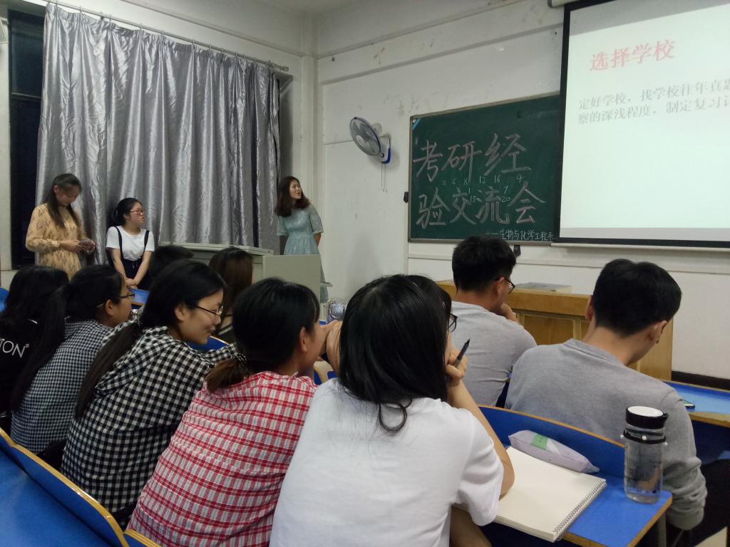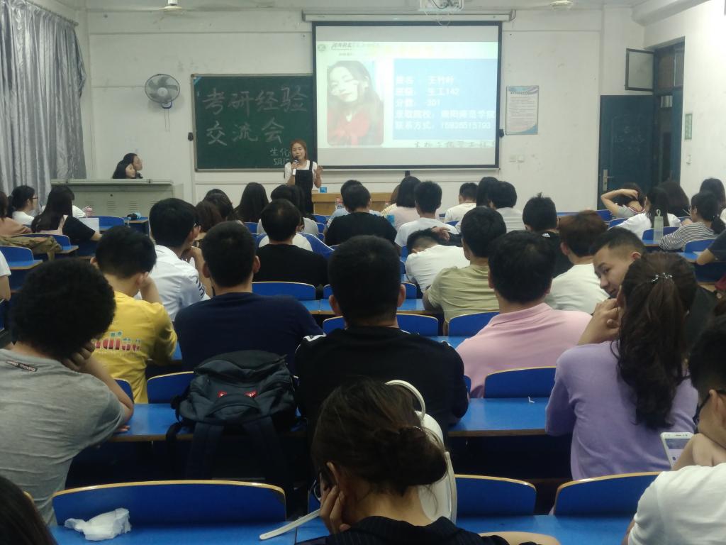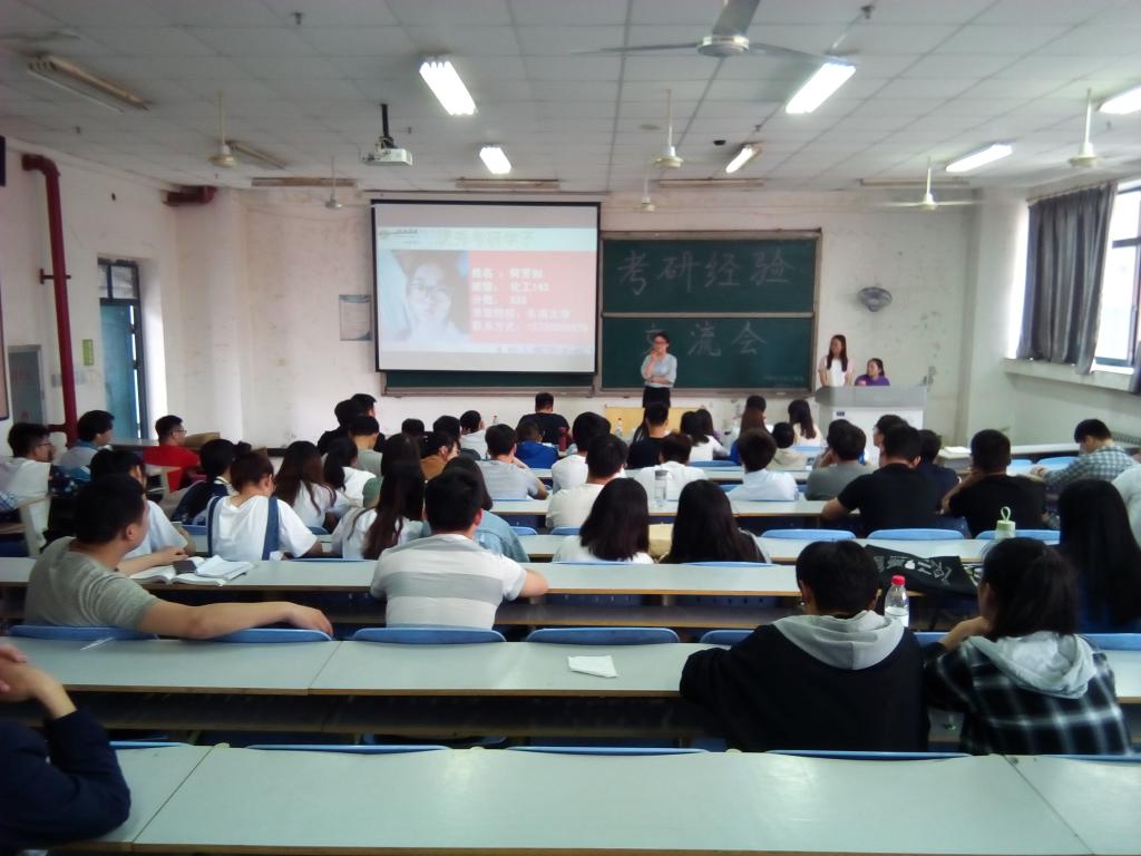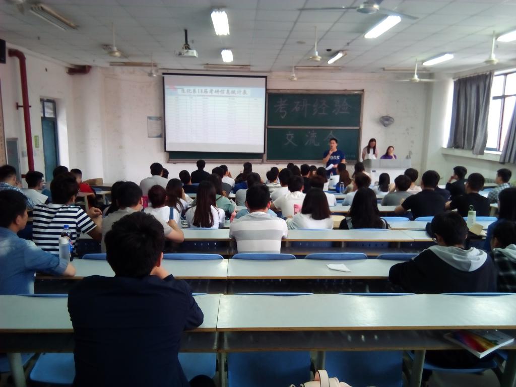 为使2015级考研学子更好的了解当前的考研形势,坚定考研信心,明确考研方向,同时加强沟通与交流,推进学风建设,生化系举办考研经验交流会系列活动。