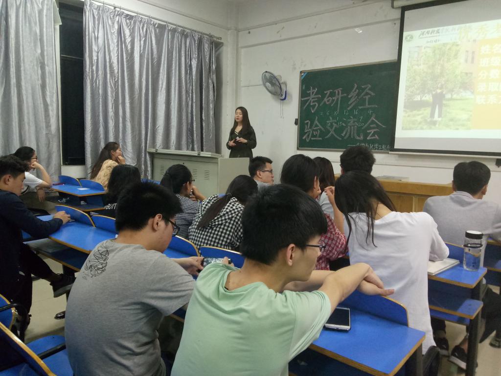5月10日晚7:30,化学工程与工艺专业在12号教学楼合二教室召开考研经验交流会,化学工程与工艺专业2015-2017级全体同学参加,2014级龚志远、何芳如、聂宇、张根旺、郑亚敏等五名优秀考研学生作考研经验分享,化学工程与工艺专业教研室曲黎、黄世江老师现场指导。