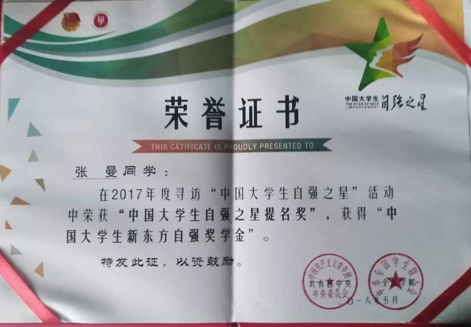 日前,由共青团中央、全国学联主办,中国青年报报社、中国高校传媒联盟承办,新东方科技教育集团协办的“2017年中国大学生自强之星”寻访活动揭晓,我院学生张曼荣获“中国大学生自强之星”提名奖,并获得“中国大学生新东方自强奖学金”。