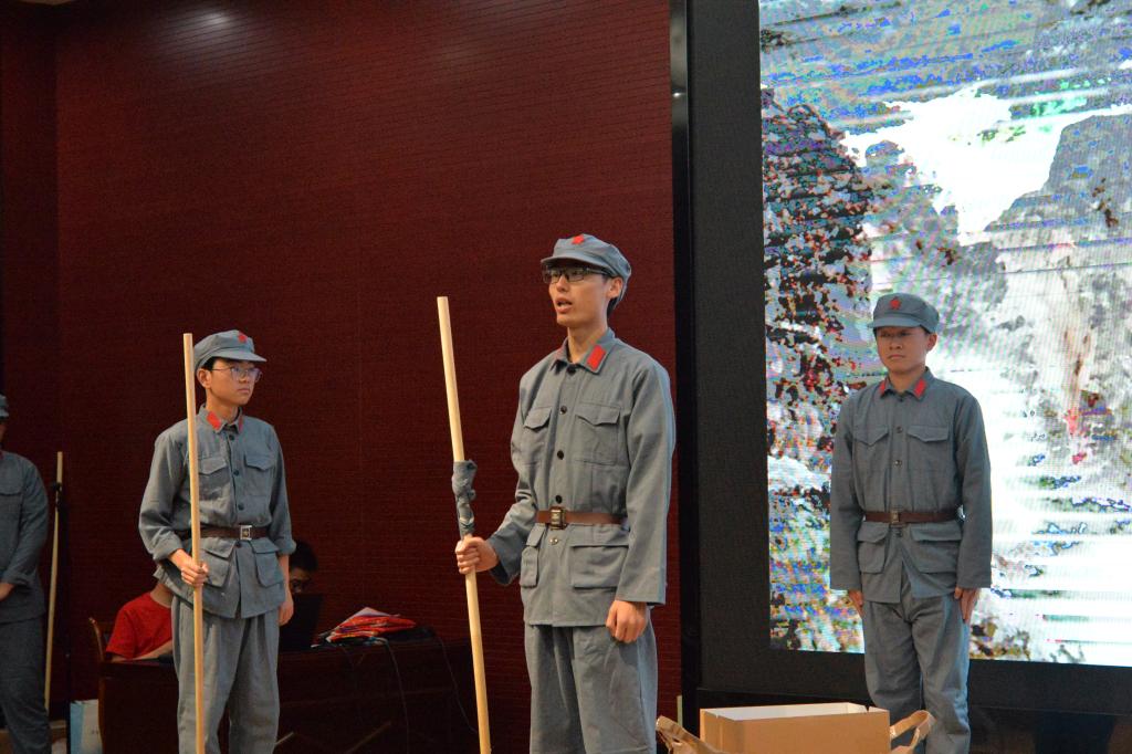 话剧演出中,同学们化身革命战士,通过表演呈现出那段革命历史璀璨辉煌的时刻。整个话剧引人入胜,队员们塑造了形形色色的人物,生动形象地展现英雄人物的坚定信念以及对革命事业的献身精神。