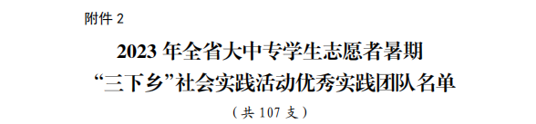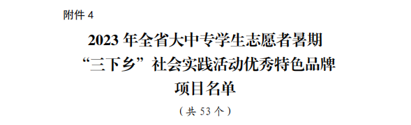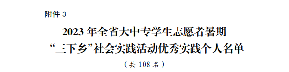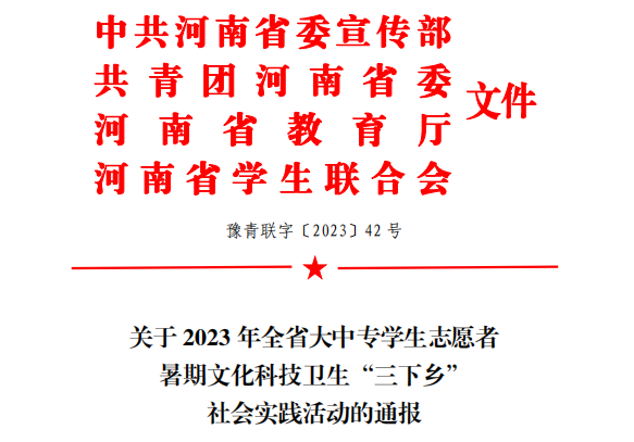 近日,由省教育厅、省学生联合会联合下发的《关于2023年全省大中专学生志愿者暑期文化科技卫生“三下乡”社会实践活动的通报》中,我校筑梦田园,美丽乡村实践团获“三下乡”社会实践活动优秀实践团队;学生处赵化冉老师获“三下乡”社会实践活动优秀实践个人;“传爱心火炬,筑我中国梦”品牌项目获“三下乡”社会实践活动优秀特色品牌项目。
