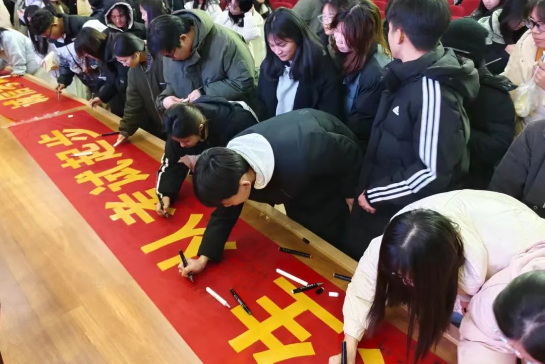 随后全体学生起立宣誓:“勤奋学习,全力以赴。牢记嘱托,不忘初心。认真备考,争分夺秒。规范答题,公平竞争。严守考纪,珍惜荣誉。铭记厚望,回报亲恩。自警自律,自尊自爱。诚信考试,不负青春。”同学们坚定的声音,表明了大家诚信对待考试的决心。最后在庄严神圣的诚信考试签名活动中,同学们有序走上前来、纷纷在宣传条幅上签下了自己的名字。