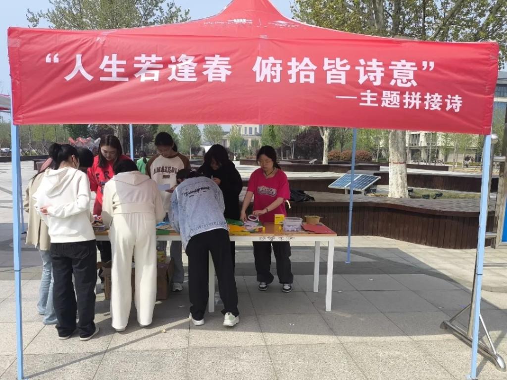 为弘扬中华优秀传统文化,丰富同学们的校园生活,营造良好的校园文化氛围,校学生会于4月11日、12日分别在南北校区广场举办了以“人生若逢春,俯拾皆诗意”为主题的拼贴诗活动。