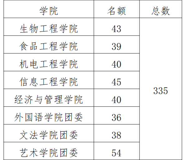 按照共青团河南省委组织部安排发展团员计划,结合各学院总人数、缴纳团费团员人数及学院团青比,各学院发展团员计划共计 335 名(详见下表)。