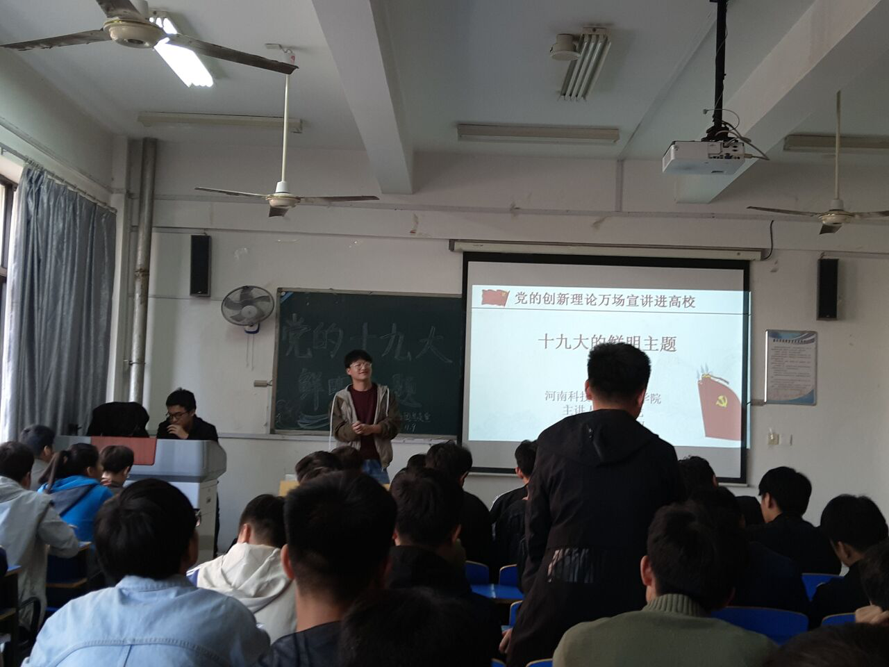 2018年10月9日中午12点,新科学院电气系在12号楼218教室举行了主题为“党的十九大精神”的团学宣讲,本次宣讲会由张连坤同学主讲,参会人员有电气系17级、18 级班委及学生会成员。
