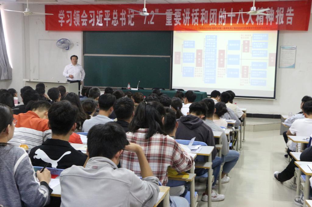 10月13日下午,校团委书记于江傲应邀在十二号教学楼合三教室为我院“青马工程”大学生骨干培训班学员作题为《认真学习贯彻习近平总书记"7.2"重要讲话和共青团十八大精神》的专题报告。我院180余位优秀学生干部聆听了报告会。报告会由院团委书记刘荣乾主持。