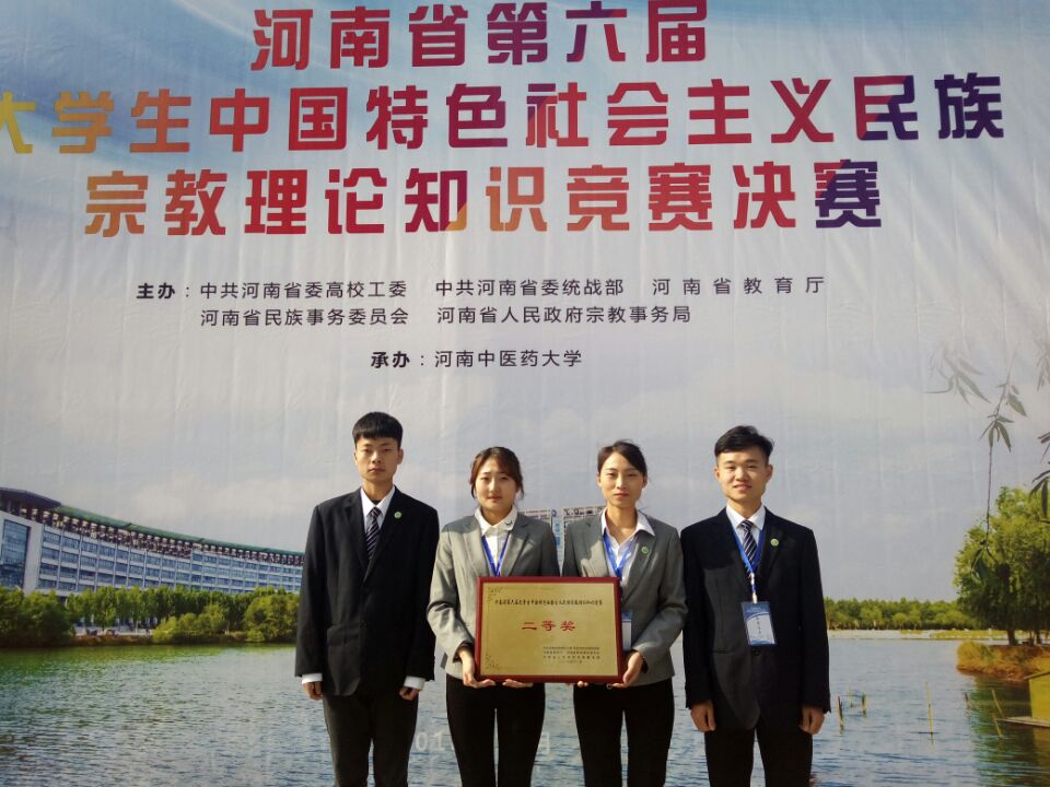 在日前结束的全省第六届大学生中国特色社会主义民族宗教理论知识竞赛决赛上,经过激烈角逐,我院代表队一举夺得决赛二等奖的好成绩,其中经济系柳巧玉获个人一等奖,信工系陈亚玲、李慧跃获个人二等奖,法律系王龙宜获个人三等奖,充分展现了我院大学生的知识素养和精神风貌,为学院赢得了荣誉。