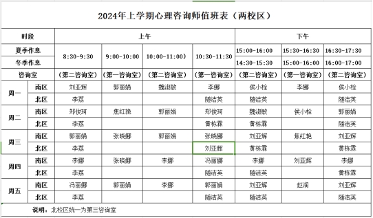 新学期,为了给我校师生提供良好的心理咨询服务,大学生心理健康教育与指导中心的心理咨询工作安排如下:
