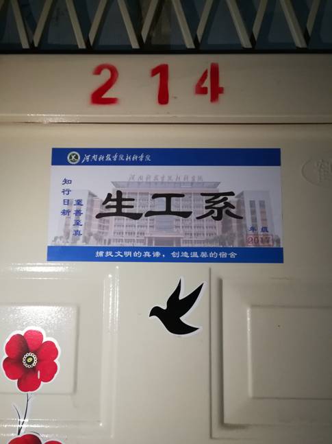 为进一步规范我院学生宿舍管理,营造干净整洁的宿舍卫生环境,在前期开展学生宿舍环境美化工作的基础上,近日,院学工部组织开展学生宿舍创意门贴统一粘贴工作。