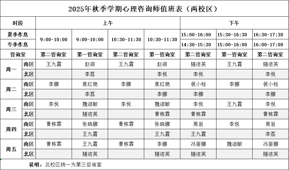 永利23411集团官网(两校区)2025-2026学年第一学期心理咨询安排