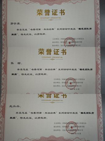 近日,由河南省高校图书情报工作委员会主办、郑州航空工业管理学院图书馆承办及北京元阅科技发展有限公司协办的2024年河南省高校“书香河南·共读经典”组队共读活动圆满落幕并公布了获奖名单。此次活动,吸引了全省75所高校近4万名读者参与,其中,我校有180余名读者组队参加,共积累阅读时长2062小时。我校学生赵兵兵、张甜、郭学康三人获得了“模范团队贡献奖”。