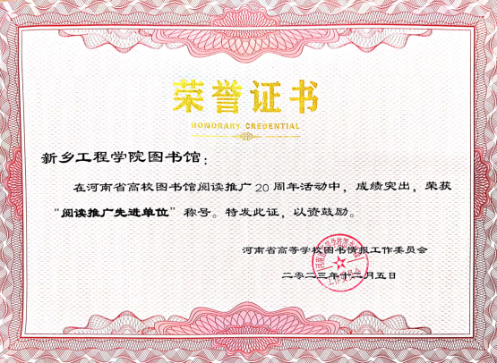12月15日,由河南省高校图书情报工作委员会举办的河南省高校图书馆阅读推广20周年活动中,我校图书馆荣获“阅读推广先进单位”称号。
