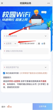 2、在预约页面选择所属学校、开通校园网所属的运营商;