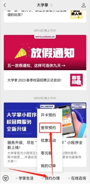 1、关注微信公众号“大学掌”点击“预约办理”“宽带预约”