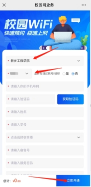 3、选择运营商后完善手机号、宿舍、学号等信息提交开通校园网。服务密码默认为123456,自己设置自己的上网密码