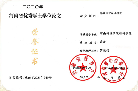 文法学院学生雷欢毕业论文获河南省优秀学士学位论文