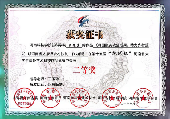 文法学院学生王俊荣获“挑战杯”河南省大学生课外学术科技作品竞赛二等奖