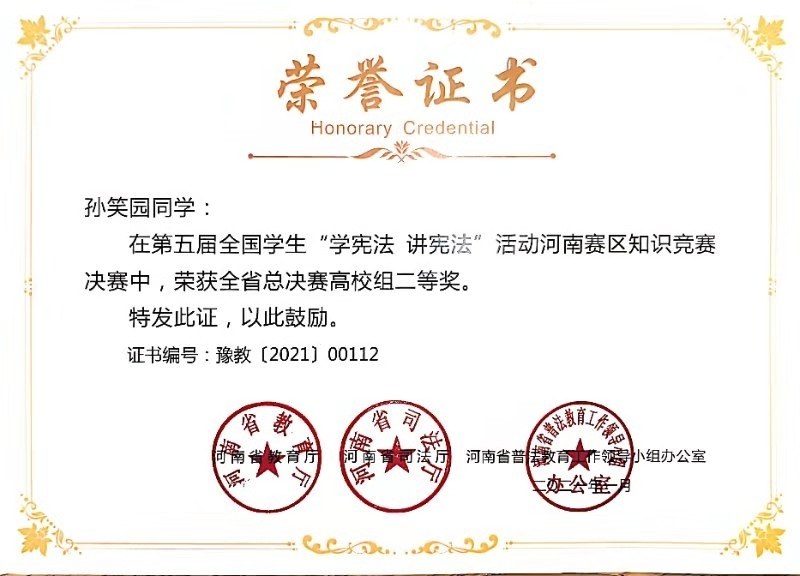 文法学院学生孙校园获河南省“学宪法 讲宪法”大赛二等奖