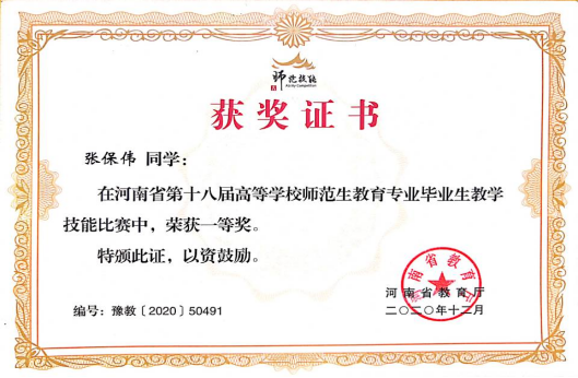 文法学院学生张保伟获河南省高等学校师范生教育专业毕业生技能比赛一等奖