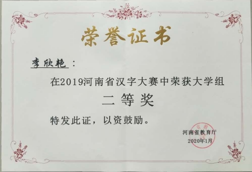 文法学院学生李欣艳获河南省汉字大赛二等奖
