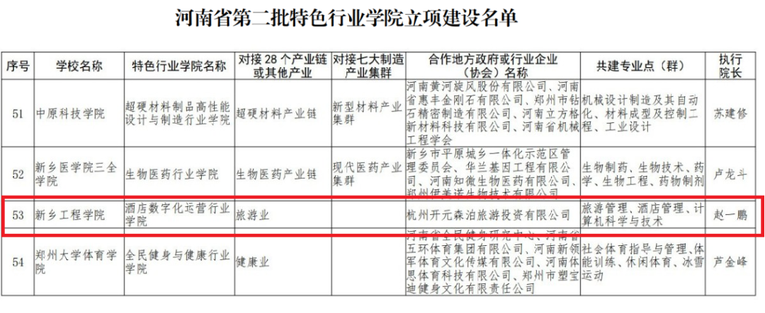 近日,《河南省教育厅等十六部门关于公布第二批省级特色行业学院立项建设单位的通知》(豫教高〔2024〕43号)公布了河南省第二批特色行业学院立项建设名单,我校酒店数字化运营行业学院获批立项。
