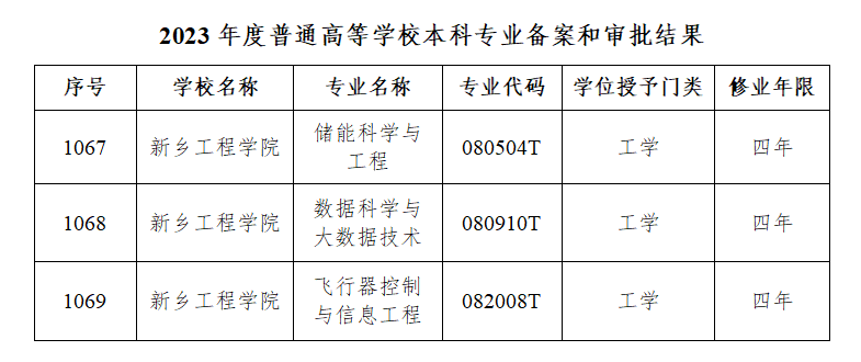 根据教育部最新发布的《关于公布2023年度普通高等学校本科专业备案和审批结果的通知》(教高函〔2024〕6号)文件,我校获批储能科学与工程、数据科学与大数据技术、飞行器控制与信息工程3个本科专业。