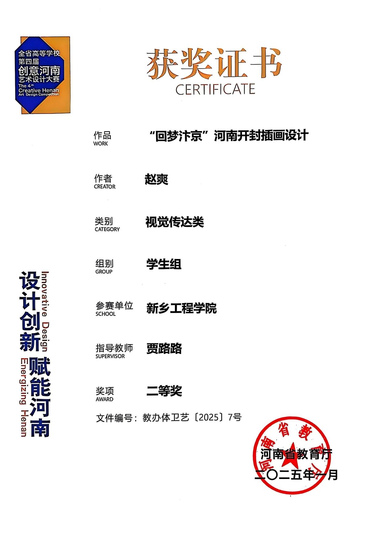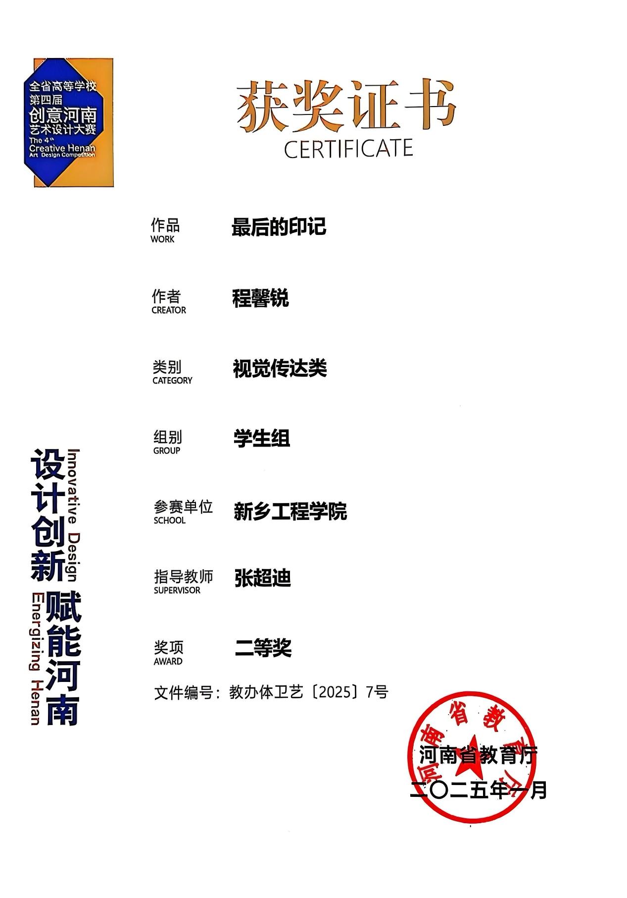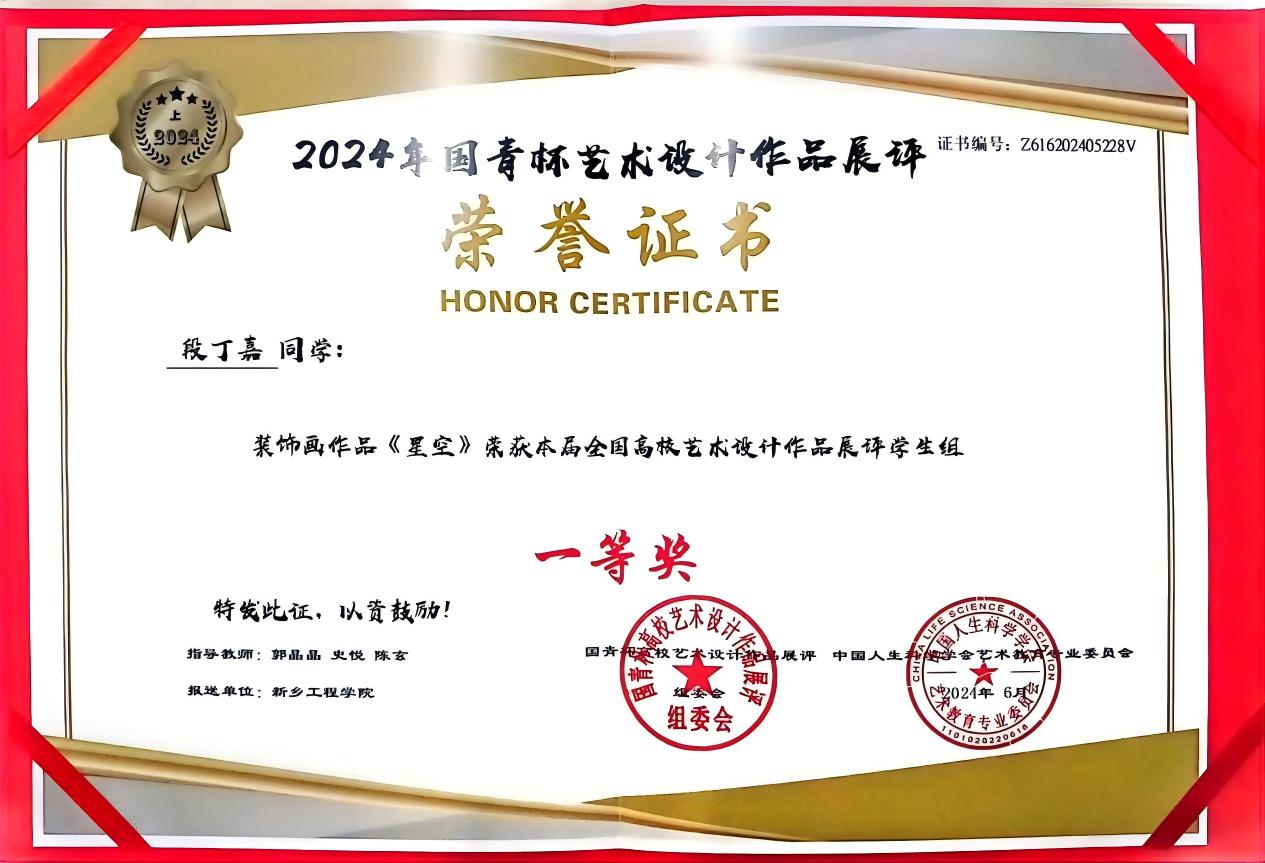 艺术学院陈培涵同学作为2025届毕业生,在本科学习期间成绩优异,获得一等奖学金、国家励志奖学金以及“三好学生”、“模范团干部”等荣誉称号。在学习期间,积极参加各种活动以及比赛,丰富自己的生活,扩展自己的视野。在大四学年通过自己的努力以及学院学校的支持最终成为一名郑州轻工业大学研究生。
