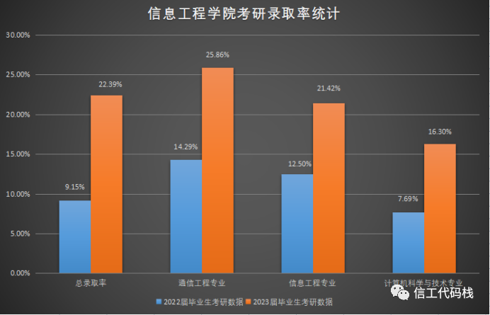 近日,信息工程学院2023届毕业生考研升学工作已落下帷幕,根据最新统计,我院2023届毕业生中共有43人成功考取硕士研究生,考研率为22.39%。其中,通信工程专业考研率25.86%,信息工程专业考研率21.42%,计算机科学与技术专业考研率16.3%,考录比达45.35%,88.1%的学生考入A类地区。学院录取人数和录取率均创历史新高,录取院校质量上也取得新的突破,学生被哈尔滨工程大学、河南大学、新疆大学等多所双一流建设高校录取。
