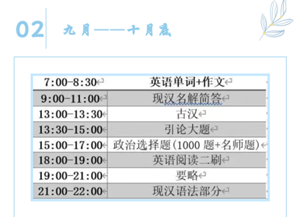 去年寒假在家决定考研开始,我就去搜寻了关于汉硕院校的各种信息,积极联系了学姐咨询目标院校的情况,到三月初学校开学时,我就开始正式备考。关于考研时间规划,我在正式备考之前不仅做了全年规划,还做了一月规划、一周规划以及细化的每日规划。对于基础薄弱的同学而言,三月到六月是打基础的黄金时期,在这期间一定要背好单词、学好语法,对于专业课的学习也要有自己的初步感知和理解;六月到九月可以开始一刷英语真题、开始政治课程的学习以及专业课的背诵了,九月到十二月可以定为冲刺阶段,英语、政治以及专业课全部都要兼顾到,根据分值占比不同来分配好自己每天的时间,定期做好复盘,养成良好的学习习惯,考研其实并没有想象中的那么艰难。