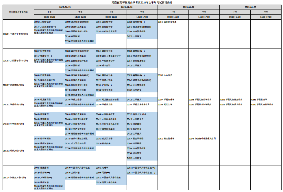 根据教育部考试院通知(教试院函〔2023〕14号)相关规定,我省2023年上半年考试时间调整为4月15日、4月16日、4月22日、4月23日,将原定于4月17日、4月18日的考试课程平移至4月22日、4月23日并增加8门国家统考课程。