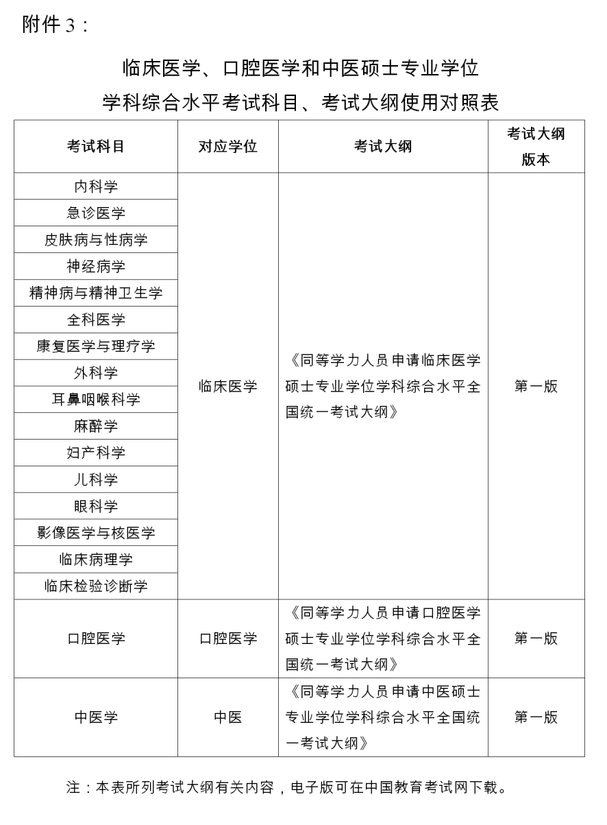 3.临床医学、口腔医学和中医硕士专业学位学科综合水平考试科目、考试大纲使用对照表