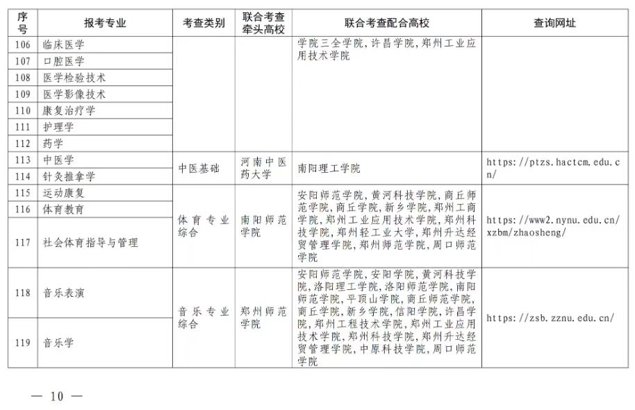 二、合理制定联考方案。各联合考查组要根据本专业大类培养目标和对考生能力的要求,结合报考情况,合理制定联合考查方案,明确高校考查时间、考查地点、考查方式、录取规则、联系电话、网址等事项。各牵头高校要于3月6日前将联合考查方案上传至“河南省普通高校招生章程核定系统”(网址:http://zszcba.haedu.gov.cn)进行核定,3月20日前向社会公布。考生可登录附表中的相关网址进行查询。