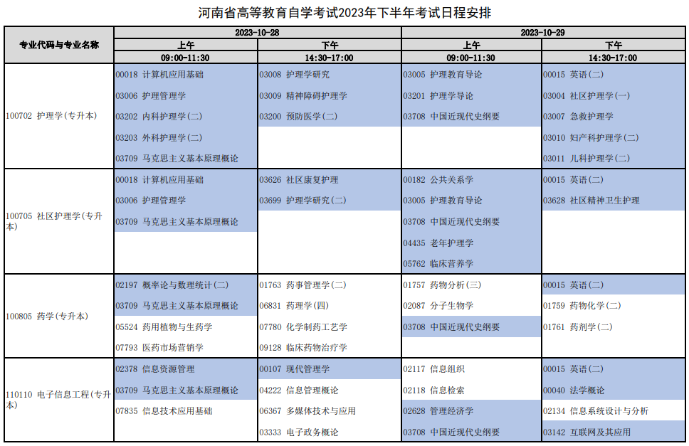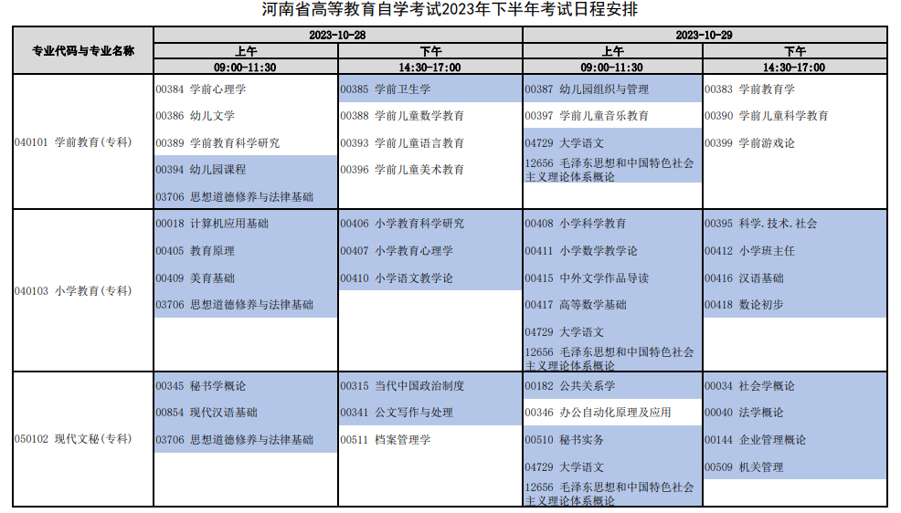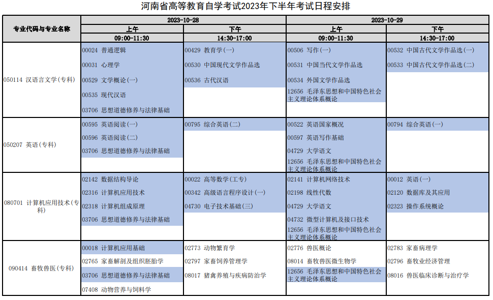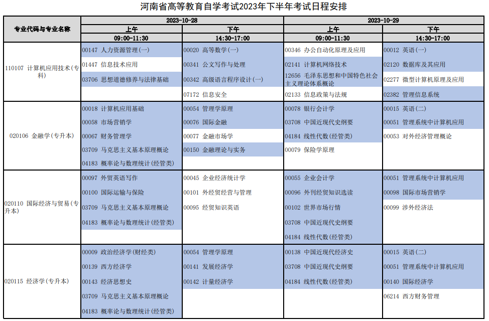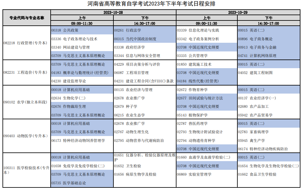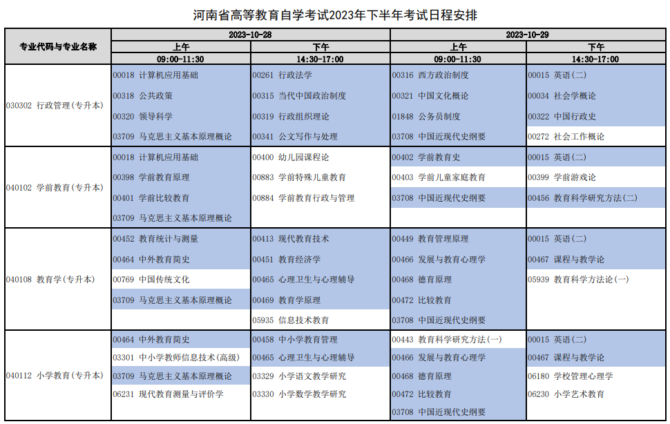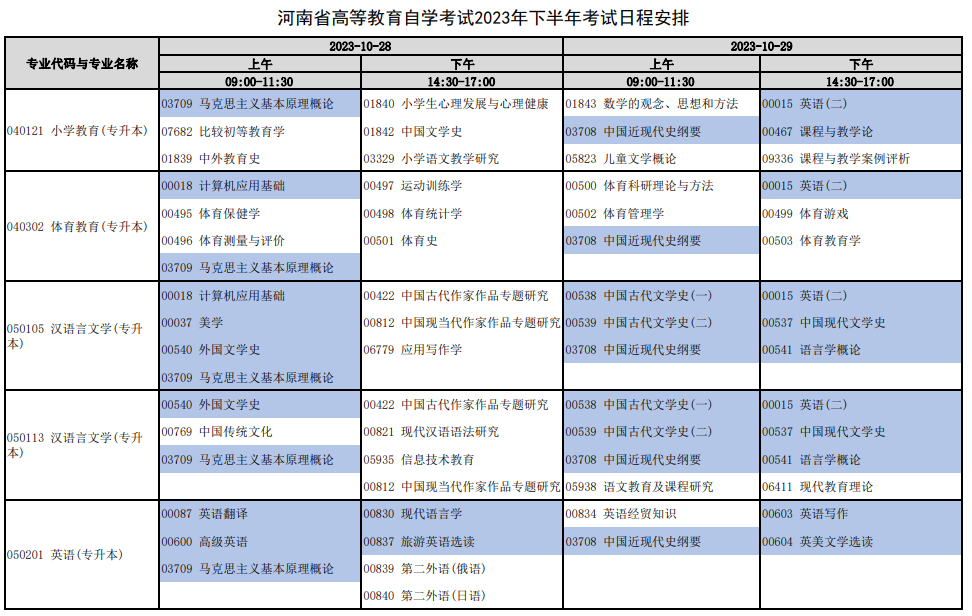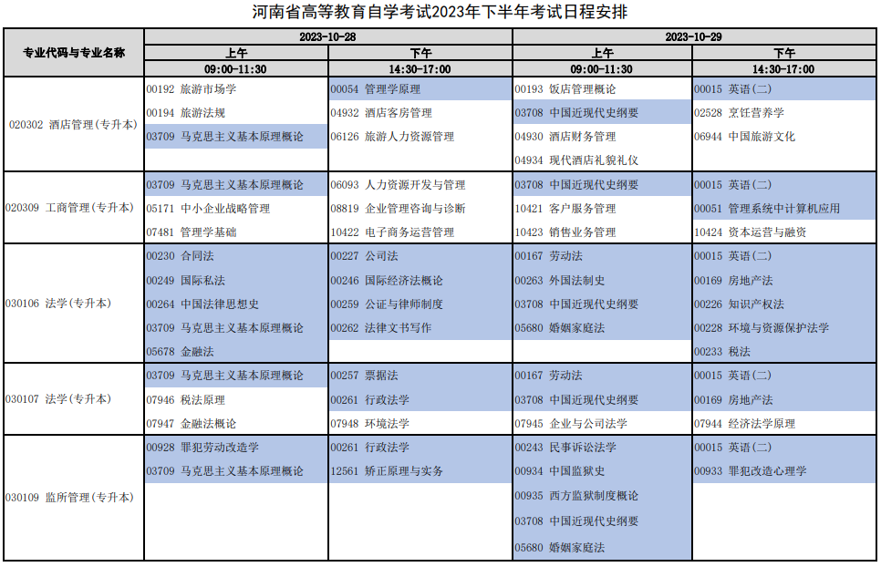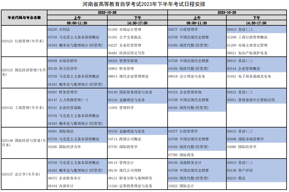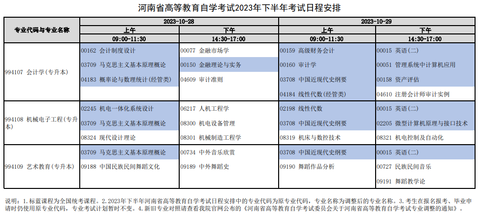 说明:1.标蓝课程为全国统考课程。2.2023年下半年河南省高等教育自学考试日程安排中的专业代码为原专业代码,专业名称为调整后的专业名称。3.考生在报名报考、毕业申请时仍使用原专业代码,专业考试计划暂时不变。4.新旧专业对照请查看我院官网公布的《河南省高等教育自学考试委员会关于河南省高等教育自学考试专业调整的通知》。