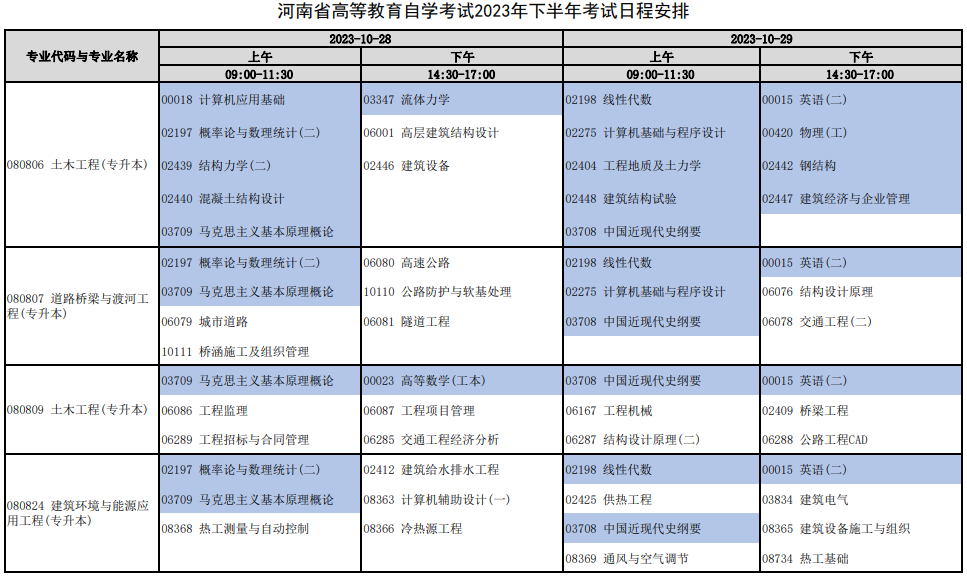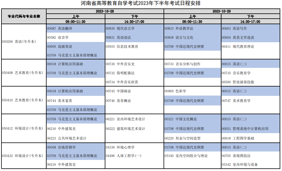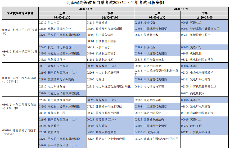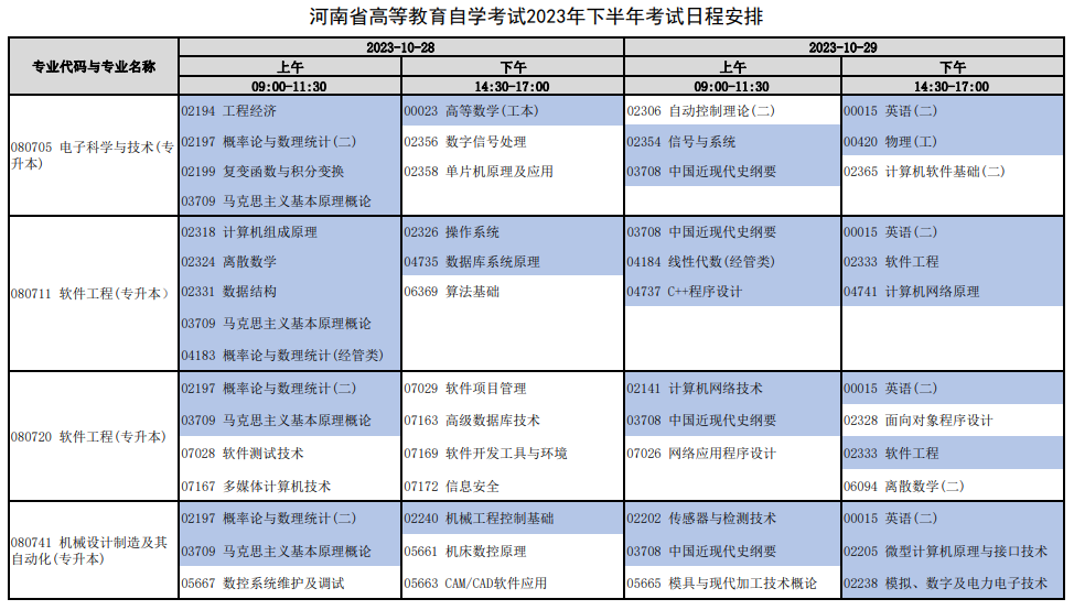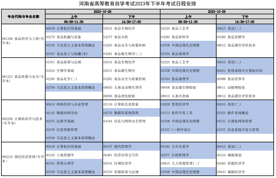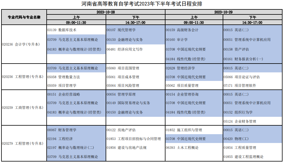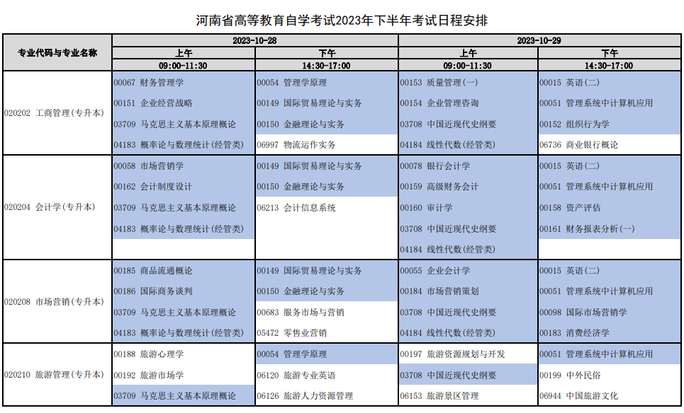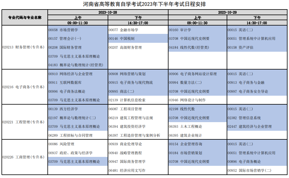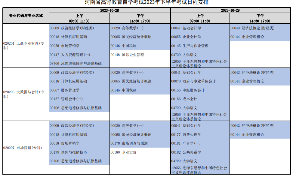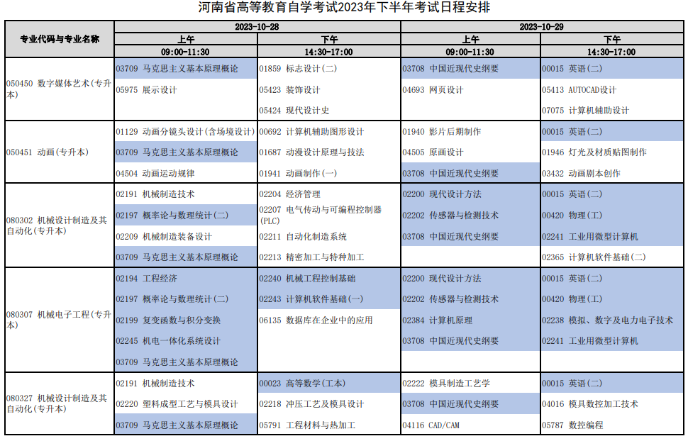 说明:1.标蓝课程为全国统考课程。2.2023年下半年河南省高等教育自学考试日程安排中的专业代码为原专业代码,专业名称为调整后的专业名称。3.考生在报名报考、毕业申请时仍使用原专业代码,专业考试计划暂时不变。4.新旧专业对照请查看我院官网公布的《河南省高等教育自学考试委员会关于河南省高等教育自学考试专业调整的通知》。